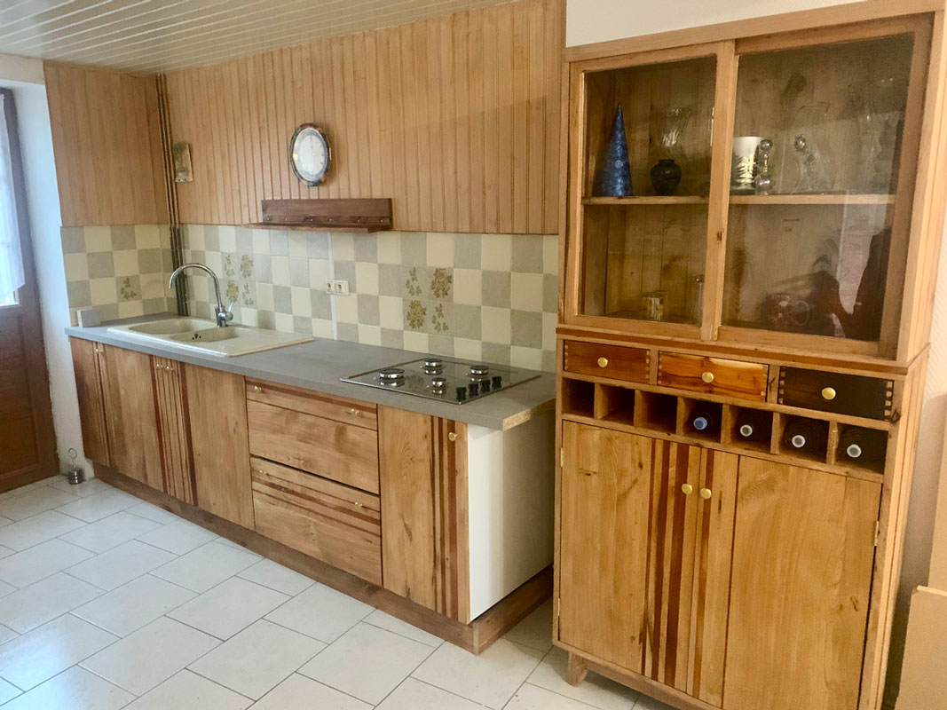 Ma cliente souhaitait de nouveaux éléments de cuisine (meubles bas) sur mesure et compléter l’aménagement de sa pièce par un vaisselier vitré et un meuble pouvant accueillir un four.